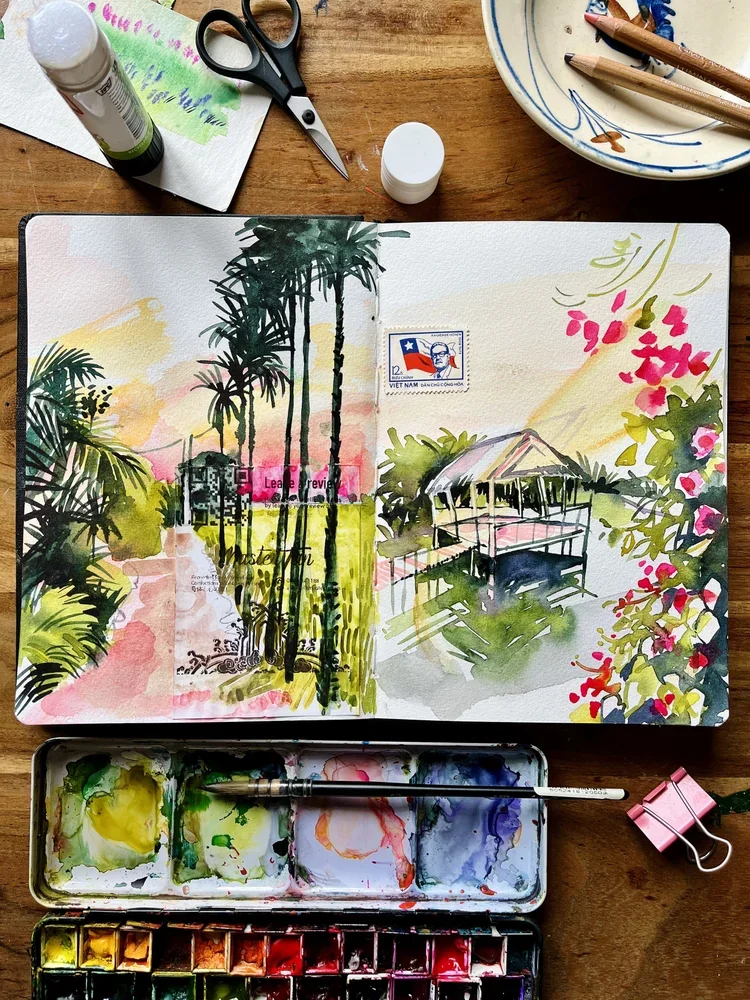 Combine watercolour, line and mixed media elements to express your own perspective of the local foods, scenes and landscapes of Hoi An.