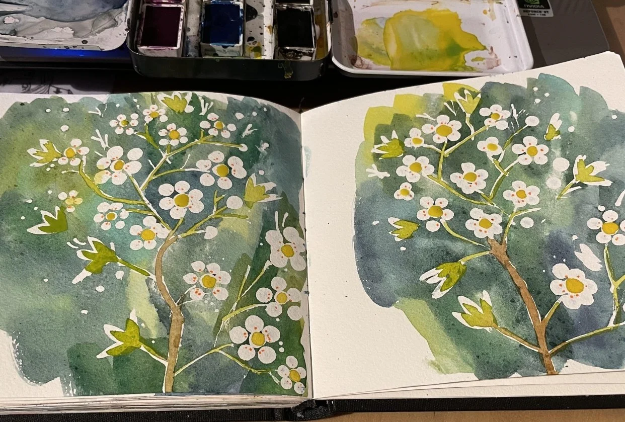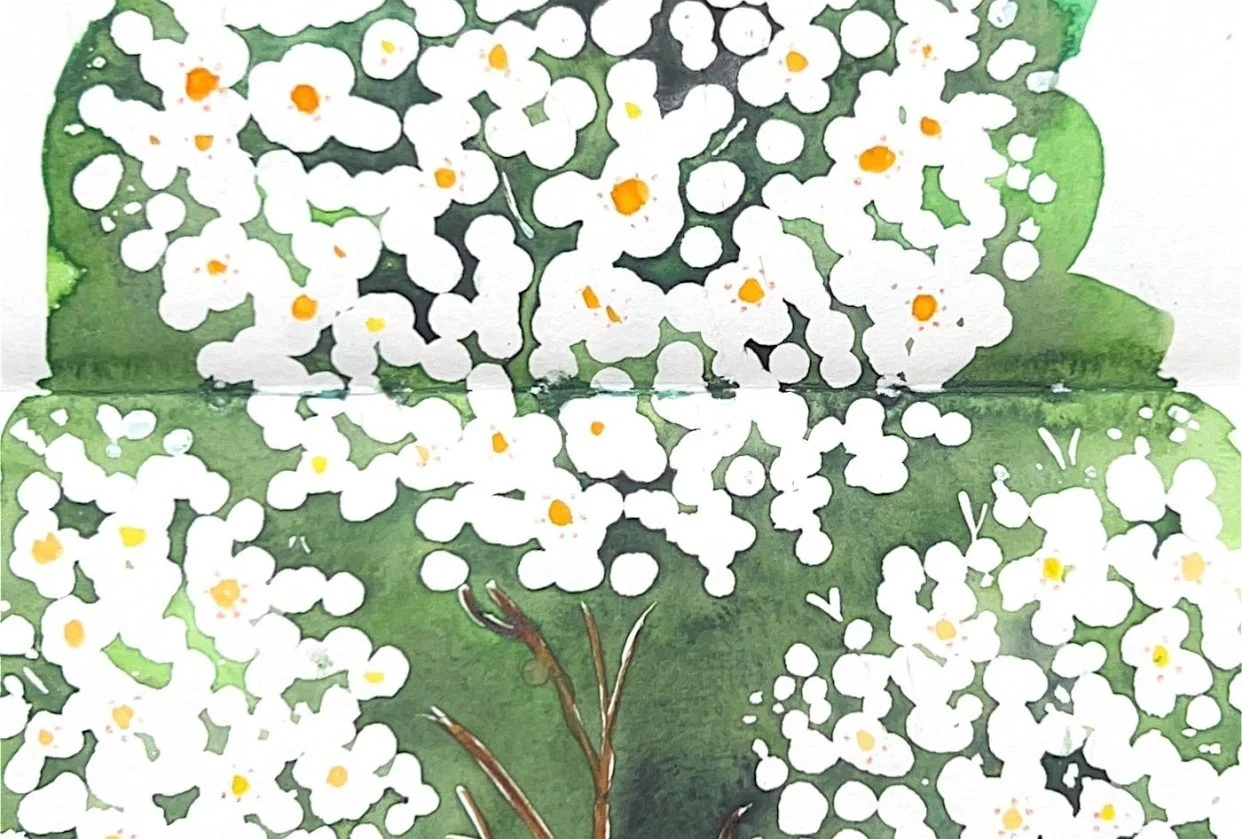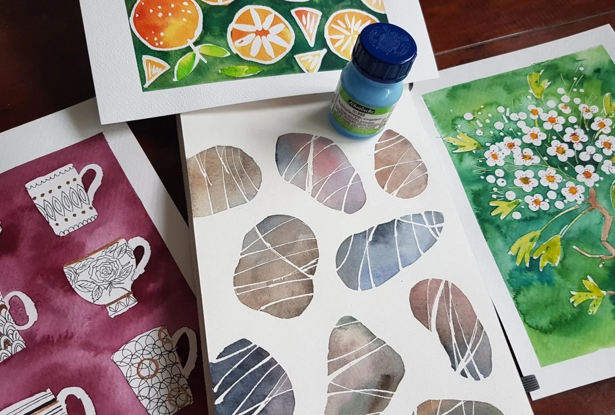This class is a relaxed exploration of using masking fluid within watercolor painting. Having a jar of masking fluid in your art box gives you options as once it’s dry it can be peeled off, revealing the untouched white paper underneath.