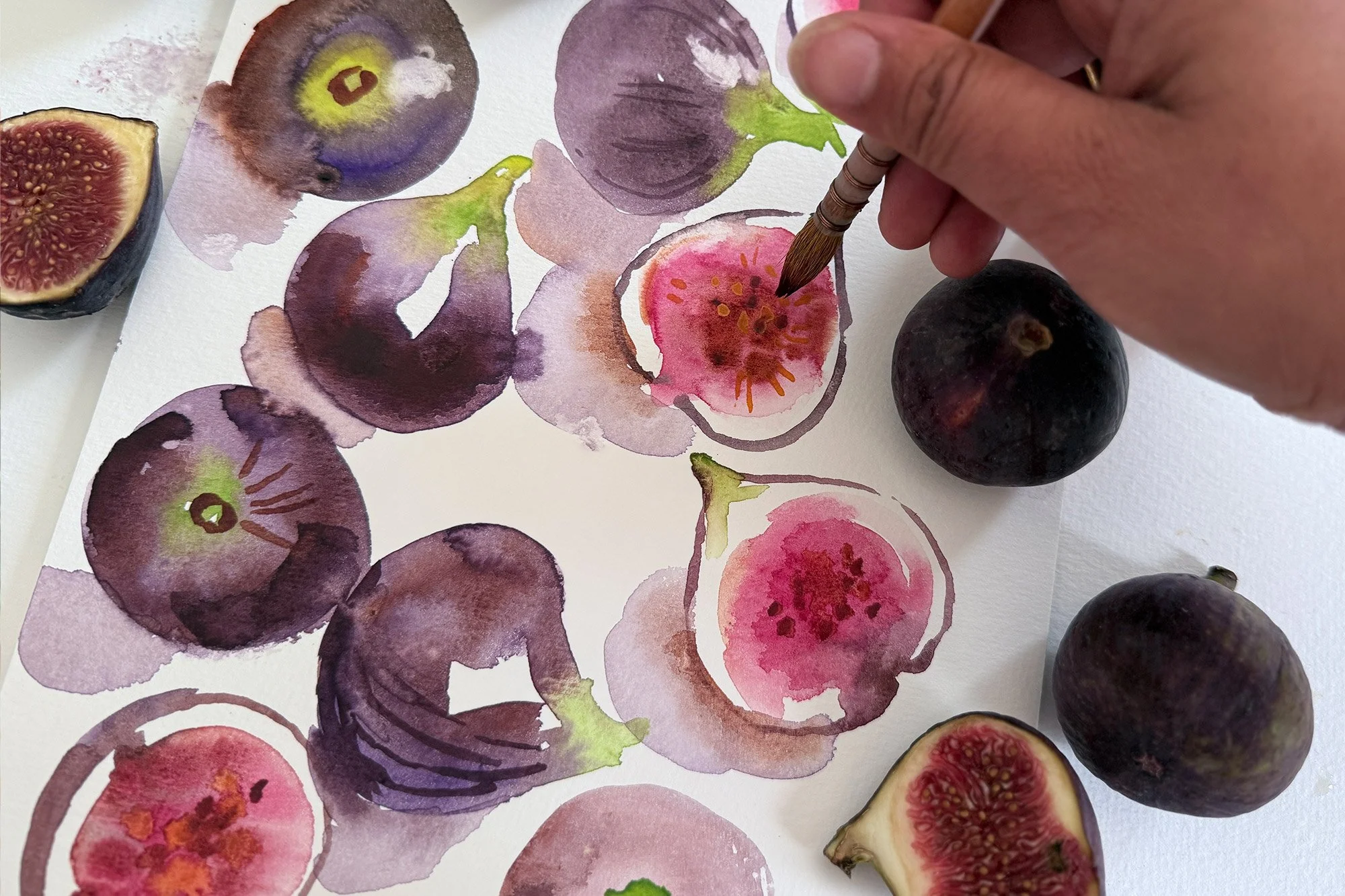 Follow four complete demos — tomatoes, figs, a pear, and spring onions — from first wash to final details.