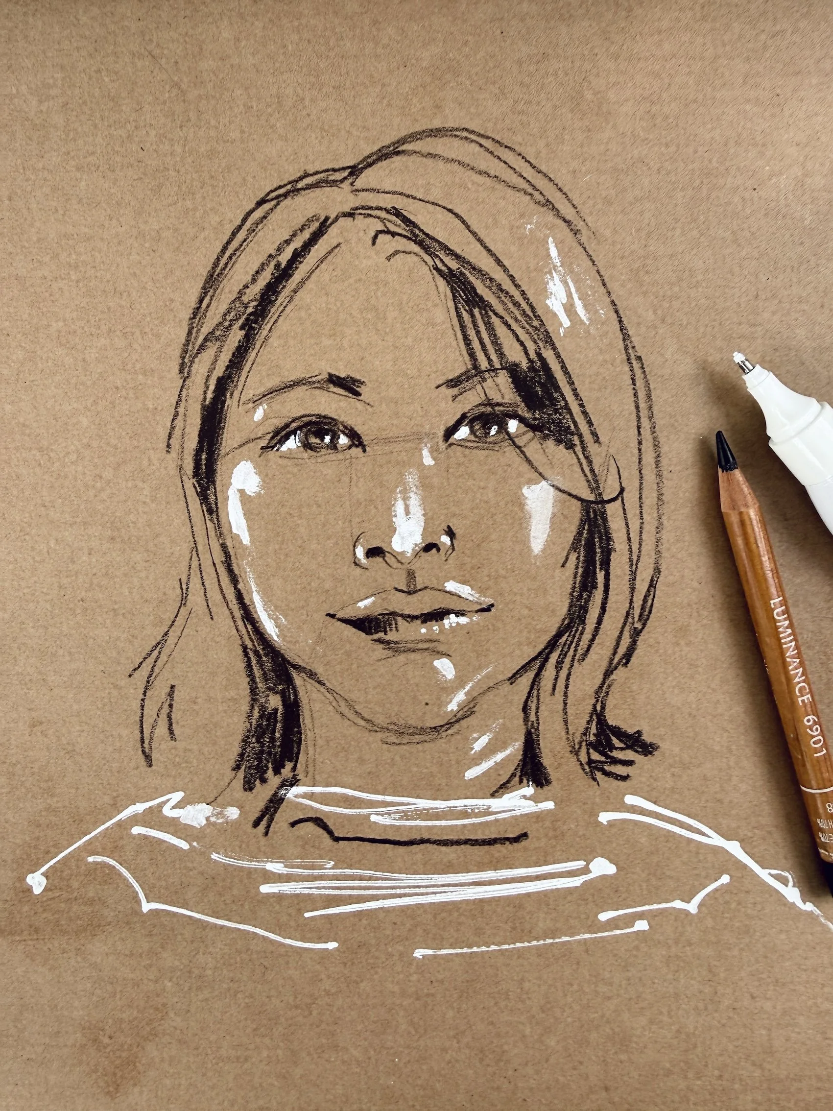 In the afternoon, we’ll apply the same technique to self portraits on toned paper. We’ll look at simplification, proportions in ways that doesn’t feel intimidating. So your portraits feel fresh, strong, and full of character.